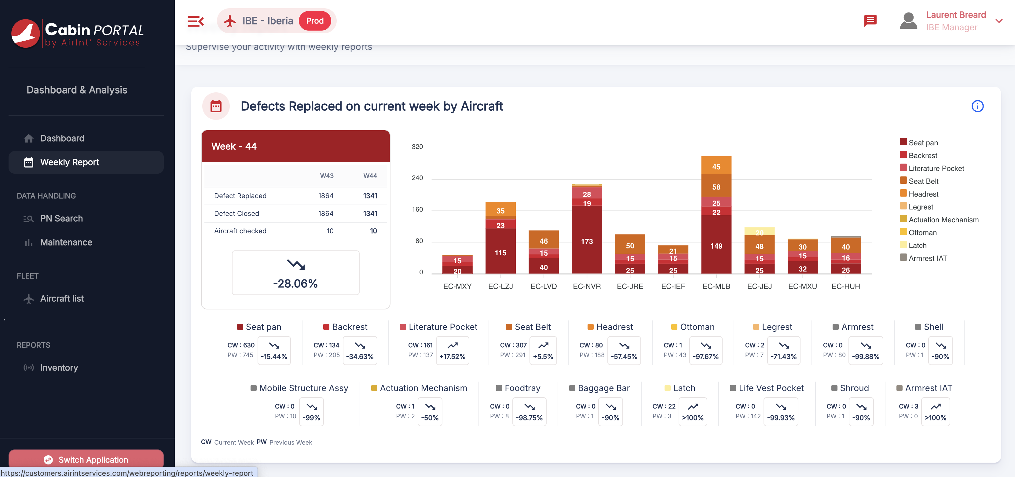 - Advanced Reporting: Generate 3 kind of reports for in-depth analysis: an aircraft registration, an equipment family (Business Class Seats, Economy Class Seats, Lavatories…etc.) and a batch of part numbers.