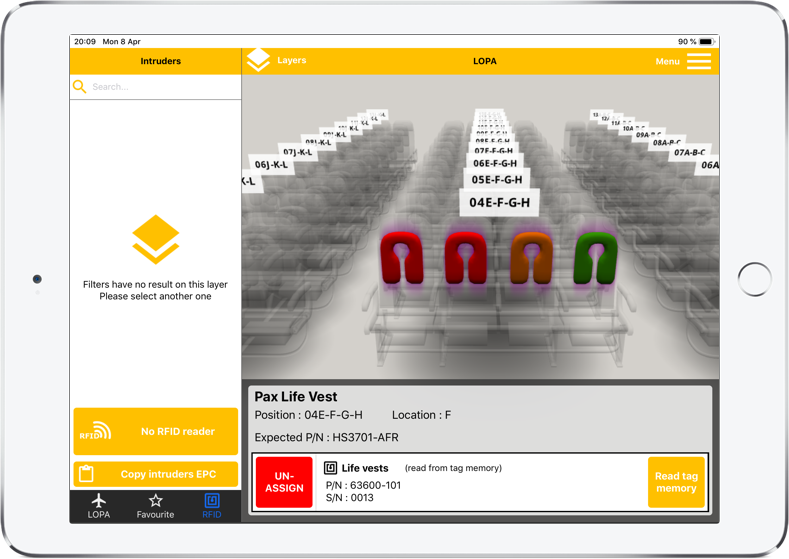- Special Mode: To initialize database with assignment of RFID tags according to the safety equipment position. No need to remove the equipment from it container thanks to the Near Field feature.